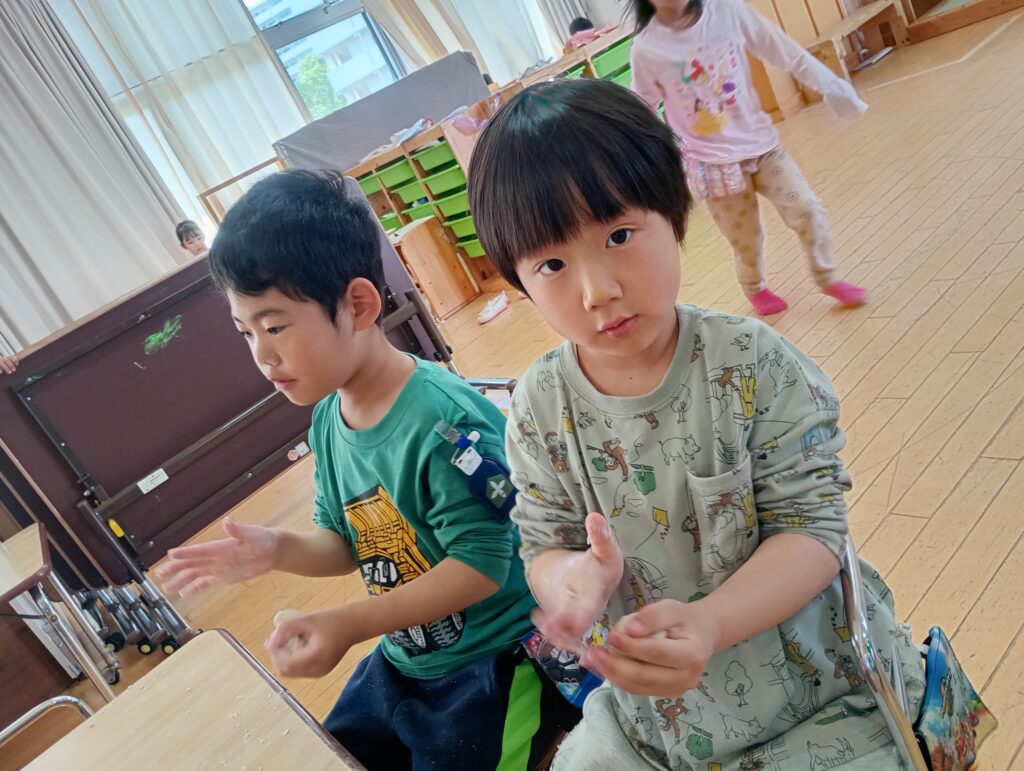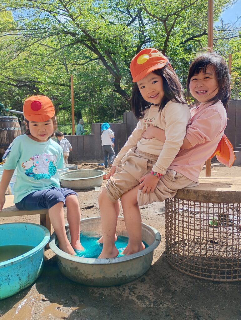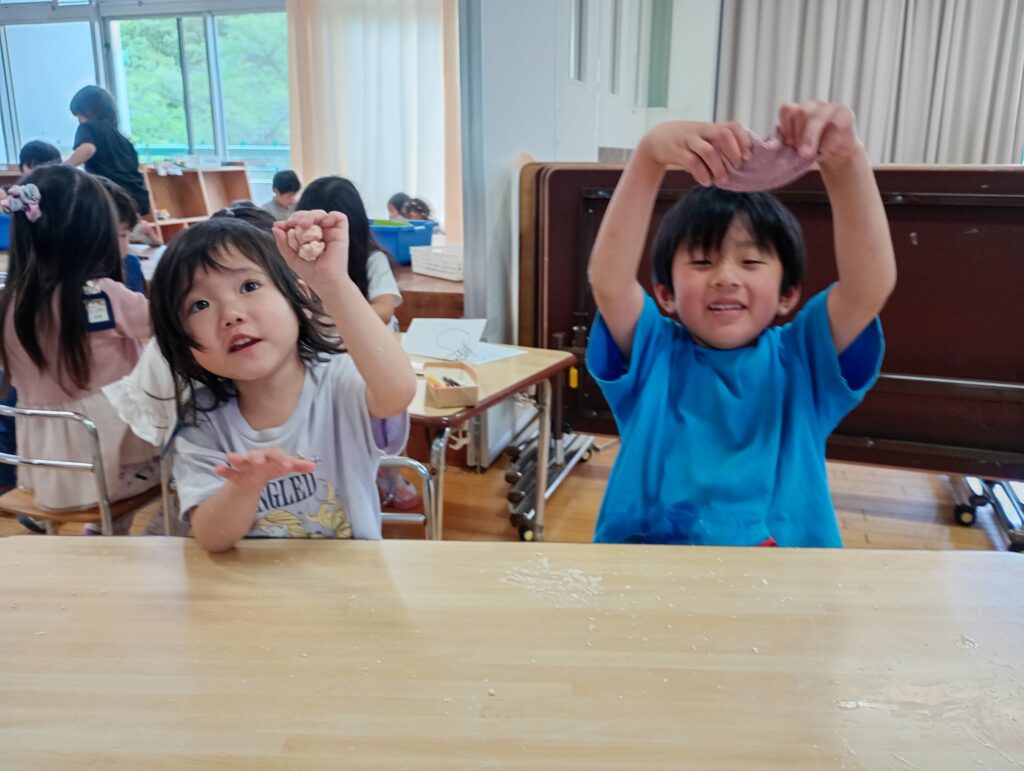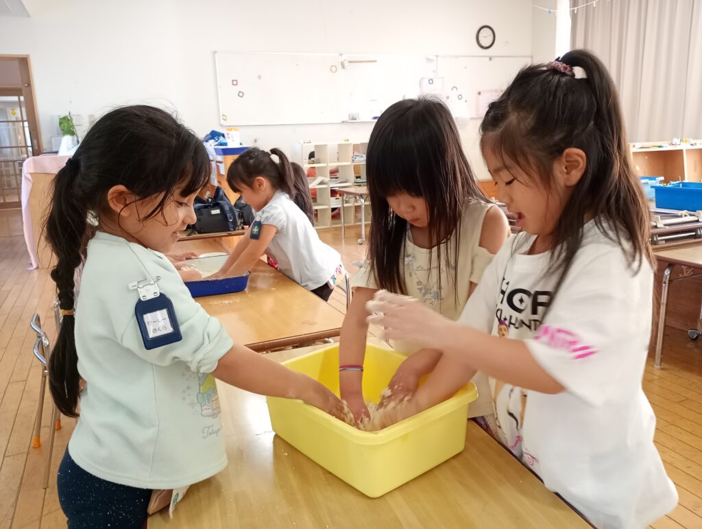 2026年4月28日 / 最終更新日時 : 2026年4月29日 ofo3_testnobi 日々の遊び ~ 年長 ~ 小麦粉粘土で感触あそび。ふわふわ・サラサラ・温かい感じ…と小麦粉に触れたあと、少しずつ水を足しながら、捏ねていきます。水を入れすぎてねちょねちょな状態になるのも、また面白い発見でした。 「なんかパンみたいな香りがする…!」『クッキーみたいに形が作れそう!』「なんだか食べたくなってきちゃった~!」と、イメージが膨らんでいる様子。 色をつけることもできるので、色が混ざり、変わっていく様子も楽しんでいました。もっちりとした感触の虜になっていました。 また、天気の良い日には、 園庭での水遊びも! 「冷たくて気持ちいい!」 『色つけたい』 「花も入れたら可愛くなりそうじゃない?」 と、おしゃれな足湯ならぬ足水を楽しみました。